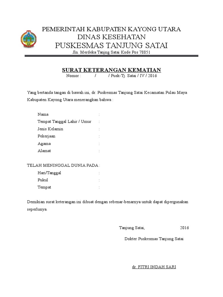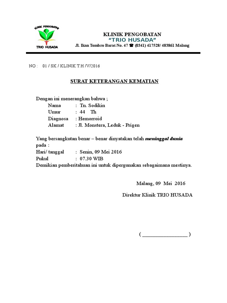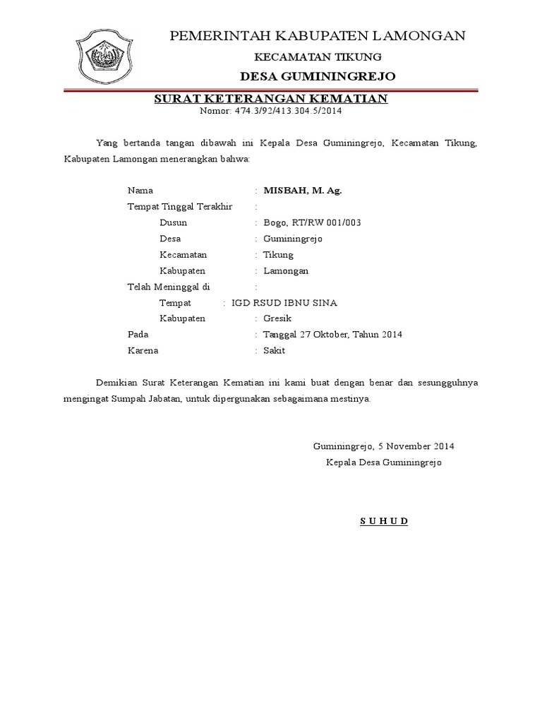 Contoh Surat Keterangan Kematian Word Mpfdocuments Website Indonesia from imgv2-1-f.scribdassets.com Untuk melihat file contoh surat keterangan sakit dari dokter yang tidak diproteksi dan bebas untuk diedit, silahkan anda kunjungi situs kami. Atas perhatian bapak, kami ucapkan terima kasih. Guna menjali komunikasi antar instansi, perusahaan kop surat berperan sangat penting untuk menunjukkan keresmian dari sebuah surat termasuk surat pengantar. Isi surat kematian yaitu berisi tentang identitas, sebab kematian, waktu dan tempat kematian. Surat keterangan kematian adalah sebuah surat yang dikeluarkan oleh kelurahan atau desa untuk menerangkan bahwa seseorang telah meninggal dunia. Tidak sedikit karyawan juga yang mungkin sudah tidak merasa cocok lagi bekerja di perusahaan tersebut, ataupun dikarenakan. Untuk format lainnya, silakan sesuaikan dengan perusahaan yang bersangkutan. Surat keterangan merupakan salah satu jenis surat yang paling sering di buat karena isi surat keterangan umumnya menyangkut aktivitas manusia.